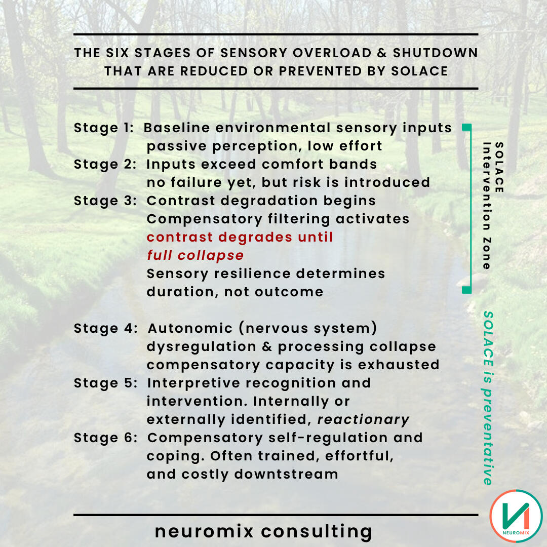 Most sensory inclusion efforts focus on awareness training, tools, or accommodations applied after problems arise.SOLACE focuses earlier in the chain: on environmental conditions, sensory interactions, and contrast patterns that create strain in the first place.Rather than asking individuals to adapt to environments, the model supports environments in adapting to human tolerance.Measurement alone is not treated as sufficient; interpretation, context, and equity considerations remain central.